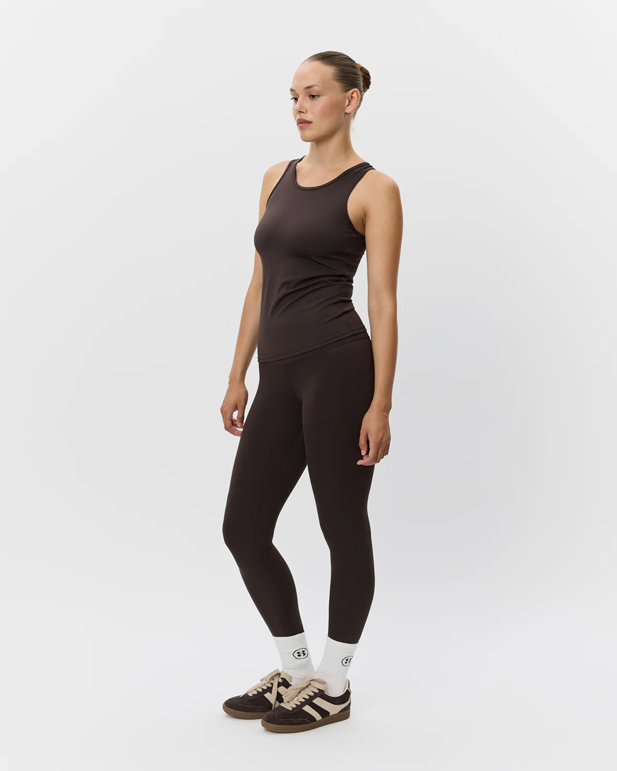 • Our popular JANETSPO top in dark brown is a classic, form-fitting A-line training top, ideal for styling with one of our workout leggings.